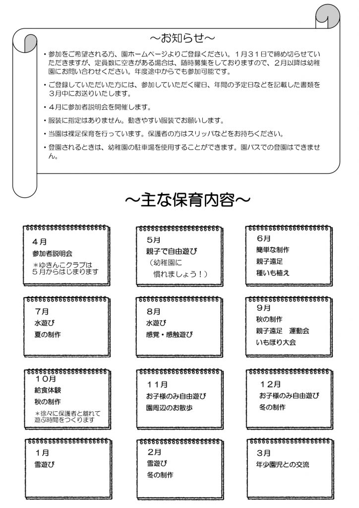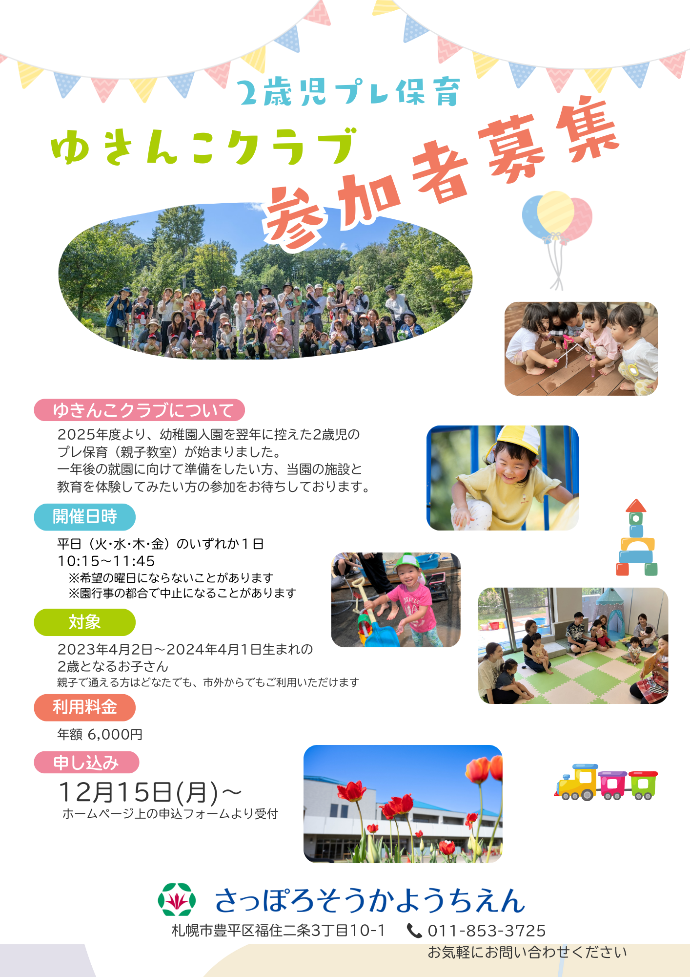 2歳児プレ保育「ゆきんこクラブ」の2026年度参加者募集を行います。 概要は下記の通りです。